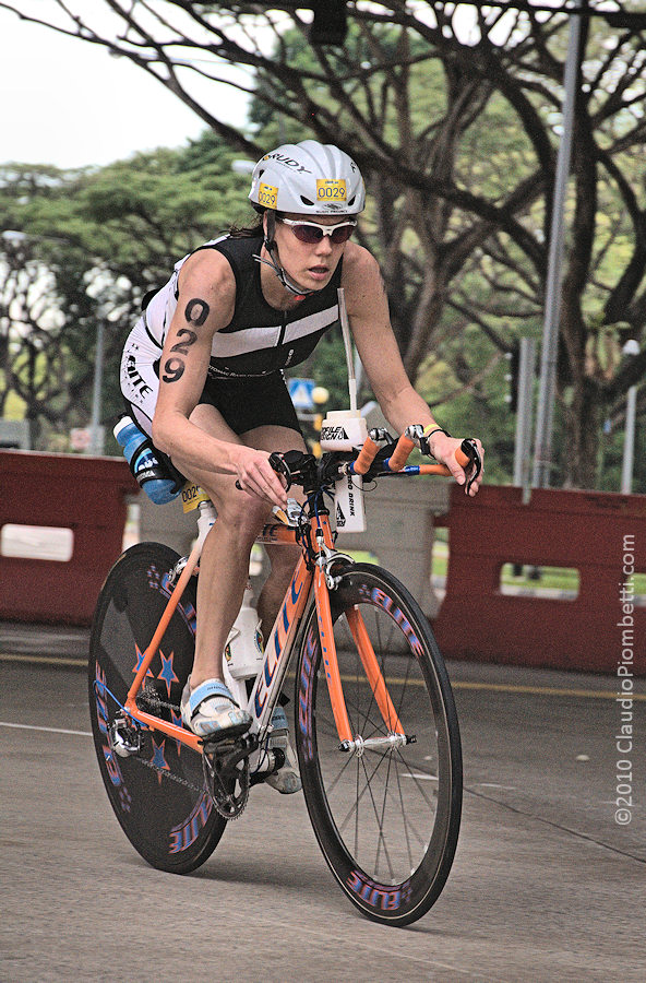 A picture of #29, Margaret Shapiro, at the recent 2010 Aviva Ironman 70.3, a triathlon competition that took place in Singapore in March 2010.